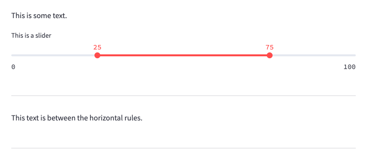 import streamlit as st st.write("This is some text.") st.slider("This is a slider", 0, 100, (25, 75)) st.divider() # ๐Ÿ‘ˆ Draws a horizontal rule st.write("This text is between the horizontal rules.") st.divider() # ๐Ÿ‘ˆ Another horizontal rule